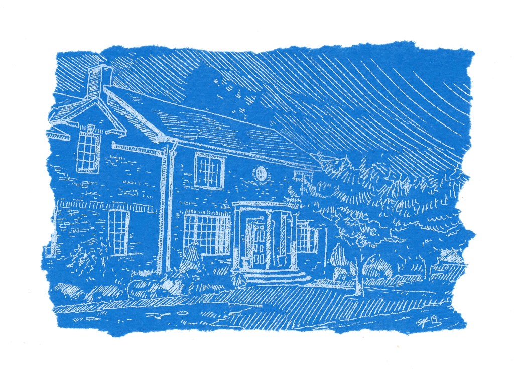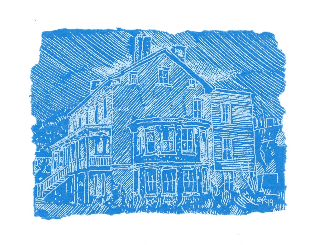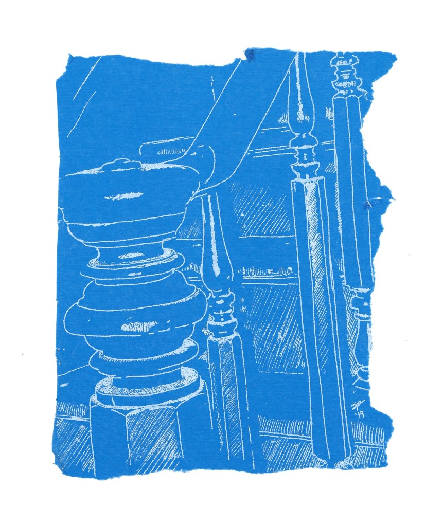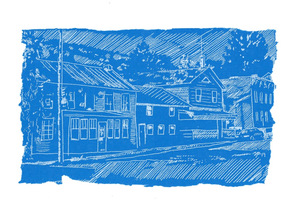 The series Blueprints That Never Were began in 2019 depicting historic buildings and elements in the Coeymans Landing Historic District, as part of the Our Town project. The significance of drawing on the cobalt blue tissue paper calls attention to the preciousness and fragility of these historic buildings, and the desire to capture their façade -in the absence of true architectural blueprints. This series gives homage to our historic architectural landscape, our homes, and the special roles they play in our daily lives.